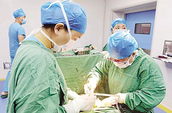 时间就是生命。进入手术室后,齐梅英等人和手术室主任张连民、护士长高敏分工协作,齐心协力。11时30分手术开始(如图),及时行剖腹探查,术中见患者腹腔大量出血,妇产科医生朱文波紧急安排护理人员到血站取血。在医护紧密配合下,经过全体医护人员半小时的通力协作,患者转危为安。术后送往重症监护室,进行后续治疗,目前患者病情稳定。
