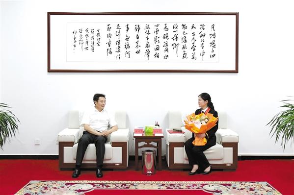 本报讯 (记者 王艳/文 王映/图) 9月1日下午,市委书记张建慧在市行政中心会见我市受表彰的全国“人民满意的公务员”——淮阳区信访局党组书记、局长王瑞霞(如图),向载誉归来的她表示热烈祝贺,并寄语全市广大公务员,要坚持以习近平新时代中国特色社会主义思想为指导,始终牢记全心全意为人民服务的宗旨,以受到表彰的先进典型为榜样,在现代化周口建设新征程上践行初心使命、勇于担当作为,以优异成绩迎接党的二十大胜利召开。