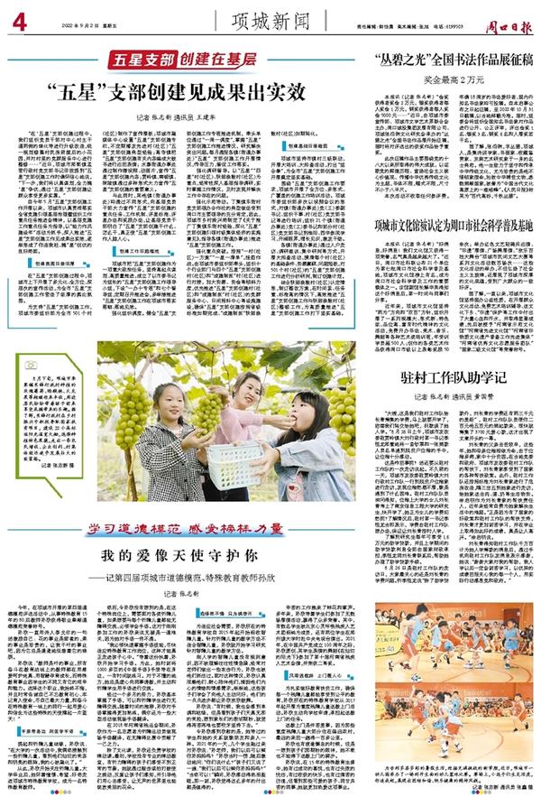 为支持“五星”支部创建工作,项城市委组织部为全市501个村(社区)制作了宣传展板;项城市融媒体中心设置“五星”支部创建专栏,不定期播发先进村(社区)“五星”支部创建典型经验;高寺镇把“五星”支部创建有关内容编成大鼓书进行巡回表演;水寨街道办事处通过制作微视频、动画片,宣传“五星”支部创建内容;贾岭镇、南顿镇、秣陵镇通过多种形式大力宣传“五星”支部创建的重要意义。