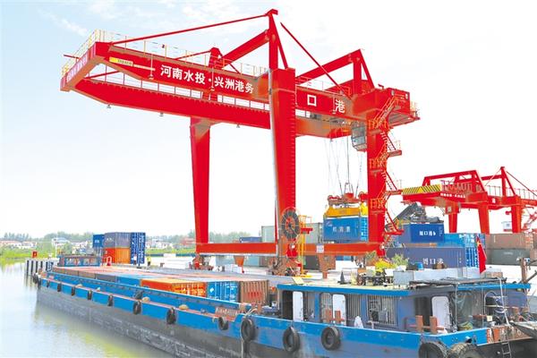 9月1日,周口中心港码头至印度蒙德拉港集装箱航线开航。图为起航前,岸边的大型吊装设备将集装箱装船。