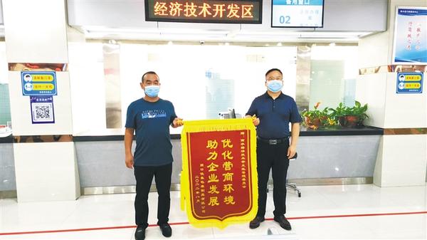 8月25日,商水县企业家代表张卫军为商水县政务服务和大数据管理中心经济技术开发区一站式服务窗口送来一面印有“优化营商环境 助力企业发展”字样的锦旗,以感谢该窗口为企业提供的优质服务。
