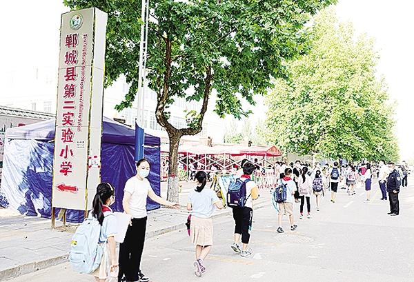 本报讯(记者 徐松 通讯员 刘超 张艳艳 文/图) “请排好队,保持1米间隔,有序进入校园。”9月7日上午8时,郸城县中小学校错峰有序开学。在该县第二实验小学大门口,学生在老师的指引下间隔一米排队测温进入校园(如图)。