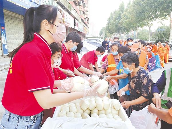 将近6点,志愿者常虹指挥人员排队领餐,队伍秩序井然。身强力壮的邵经歌健步如飞,来回端运粥、菜,几位女志愿者一字排开,打粥、盛菜、发馒头,配合默契,行云流水,早餐很快分完。