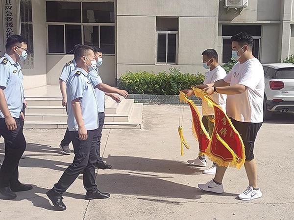 本报讯 (记者 王凯 通讯员 曹丛丛 文/图) 9月5日上午,商水县城关乡董营行政村村民郭亚博将印有“品德高尚、当代雷锋,为民办实事衷心感谢”字样的锦旗送到商水县应急管理局(如图)。