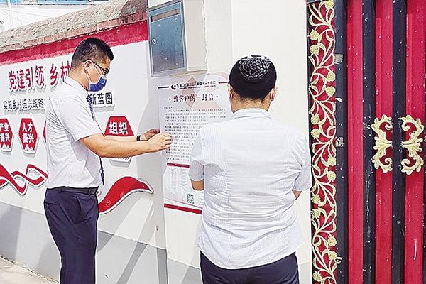 ③淮阳农信联社工作人员在村室门口张贴“致客户的一封信”。