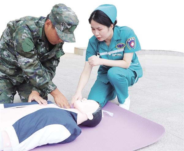 课堂上,指导老师用“现场模拟”培训方式,指导新兵如何快速判断并正确实施抢救的方法,让新兵“身临其境”,反复练习,将学到的急救技能熟练的应用到实际中,达到最佳培训效果。生动直观的教学,使在场的每一位新兵积极性高涨,新兵在老师的指导下分组进行了实地操作演练,并能及时准确实施心肺复苏术。