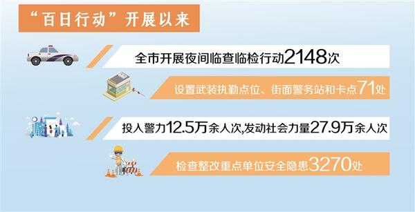 “百日行动”开展以来,全市开展夜间临查临检行动2148次,设置武装执勤点位、街面警务站和卡点71处,投入警力12.5万余人次,发动社会力量27.9万余人次,盘查人员116708人次、车辆9.3万余台次,检查整改重点单位安全隐患3270处。