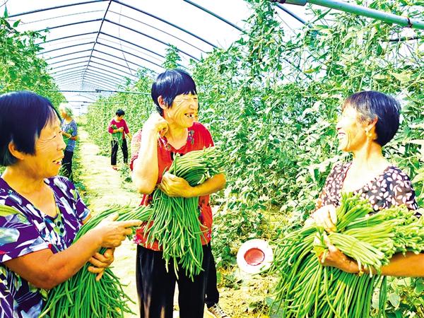 ②大棚内,摘完豆角的几位大娘开心交谈。