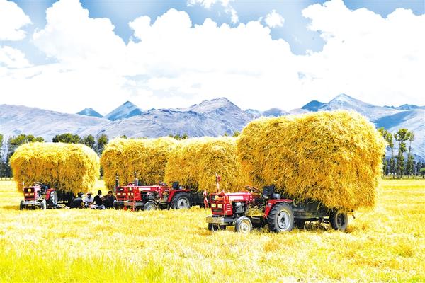 第五个中国农民丰收节在即,西藏自治区拉萨市林周县的田间地头一片繁忙。据了解,林周县目前累计粮食收获面积为12.43万亩,已收获秋粮总产量预估6万吨,丰收在望。新华社记者 觉果 摄