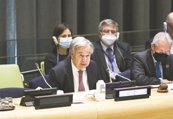 9月26日,在位于纽约的联合国总部,联合国秘书长古特雷斯(前左)在纪念“彻底消除核武器国际日”高级别会议上致辞。
