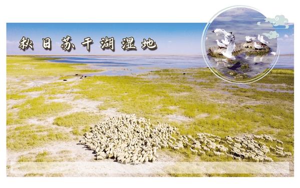9月27日,牛羊在大苏干湖畔觅食(无人机照片)。金秋时节,地处甘肃省酒泉市阿克塞哈萨克族自治县境内的大、小苏干湖湿地候鸟飞舞、骏马驰骋、牛羊觅食,色彩斑斓的草原充满诗情画意。新华社发(高宏善 摄)