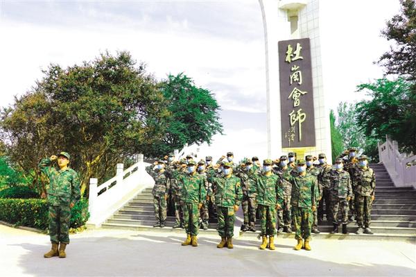 9月22日上午,西华县人武部组织全体党员开展“喜迎二十大、奋进新征程”专题教育活动。图为党员在杜岗会师纪念碑前重温入党誓词。