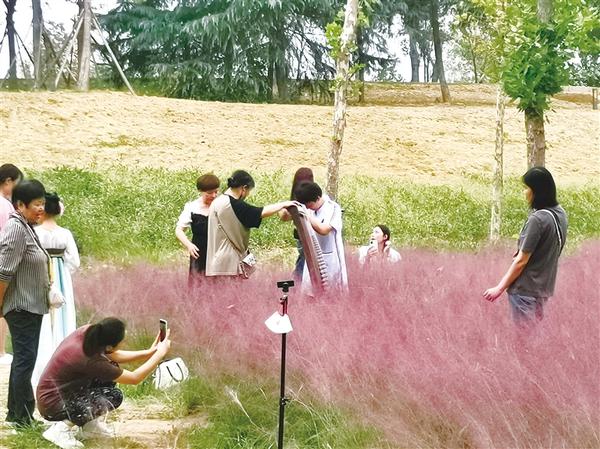 当天下午,记者在沙颍河湿地公园(周口大道至大庆路段)南岸一大片粉黛乱子草前,看到一家摄影机构的摄影师不顾园林工人的劝阻,多次闯入花海中取景、摆造型拍摄,把粉黛乱子草压倒一片又一片(如图),看到大家都在谴责他的不文明行为,才极不情愿地走岀花海。