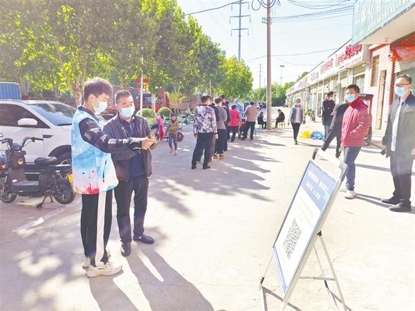 本报讯 (记者 王晨 文/图) 10月8日,开发区进行10月份第三轮核酸检测。核酸检测现场,记者看到一个个身穿蓝色马甲的“道德文明使者”积极主动维护秩序、协助录入信息、为群众提供指导帮助等,确保核酸检测工作高效有序进行。