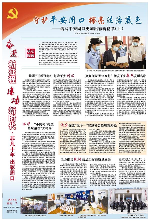 回眸我市近年来政法工作奋斗历程,周口政法人一路高歌,民主法治在三川大地上镌刻着深深印记,绽放出灿烂的“和谐花”,结出香甜的“平安果”。为全方位、多角度展现我市深入推进平安周口建设的举措成效、典型经验,聚焦担当为民“小切口”,展现平安建设“大作为”,本报特别推出“谱写平安周口更加出彩新篇章”专题策划,为推动更高水平平安周口、法治周口建设营造浓厚舆论氛围,以优异成绩迎接党的二十大胜利召开。
