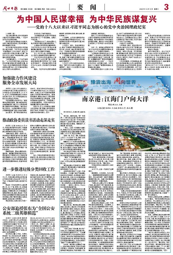 “周口市公路货运非常发达,作为中原地区,到达周边地市都非常方便,就连从周口来我们南京港也有很多货物是通过汽车到达上游的七坝港区。如果周口港大力发展公、铁、水转运模式,一定大有可为。”曹红军说,“待江淮运河开通后,南京港将是周口航运可到达的最近的‘海港’。下一步,我们将加强与周口港的联系和合作,共同携手助力区域高质量发展。”②15