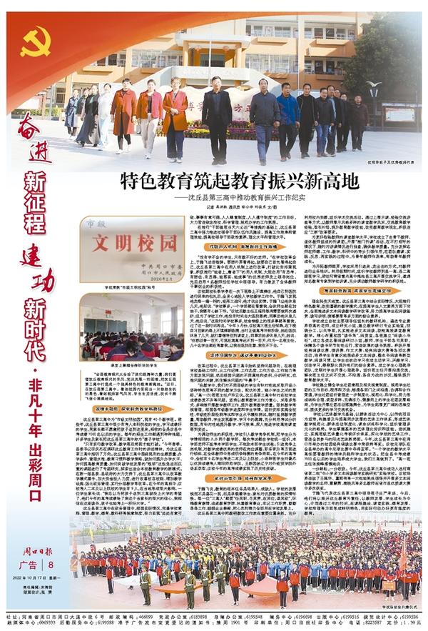 理念转变天地宽。沈丘县第三高中结合实际情况,大胆推行特色教育,改变僵硬的教学模式,在提高学生人文素养方面下功夫,全面推进多文本阅读教学研学改革,努力提高学生在阅读鉴赏、读写讲颂、演播赛展等多方面的综合素养。
