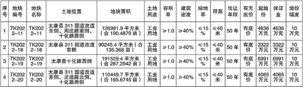 五、拍卖时间及网址 拍卖报价时间为:TK2022-11地块:2022年11月11日10时30分;TK2022-18地块:2022年11月11日10时40分;TK2022-19地块:2022年11月11日10时50分;TK2022-20地块:2022年11月11日11时。拍卖网址:周口公共资源交易系统(网址:http://jyzx.zhoukou.gov.cn)。