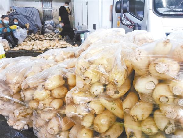 10月23日,走进周口黄淮市场,各个交易区里一辆辆满载果蔬的大型物流车有序停放,市场里土豆、白菜、青椒、莲藕、西红柿等常用蔬菜供应充足。