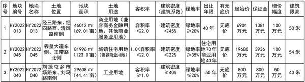 五、拍卖时间及网址 拍卖报价时间:HY2022013地块:2022年11月25日10时,HY2022045地块:2022年11月25日10时10分,HY2022040地块:2022年11月25日10时20分,拍卖网址:周口公共资源交易系统(网址:http://jyzx.zhoukou.gov.cn)。