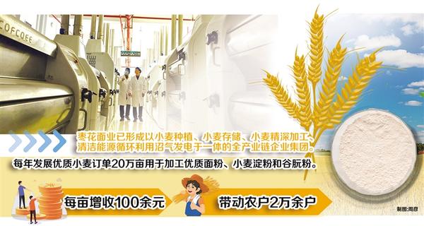 经过近几年发展,如今的枣花面业已形成以小麦种植、小麦存储、小麦精深加工、清洁能源循环利用沼气发电于一体的全产业链企业集团,每年发展优质小麦订单20万亩用于加工优质面粉、小麦淀粉和谷朊粉,帮助农民每亩小麦增收100余元,带动2万余户农民走上致富路。
