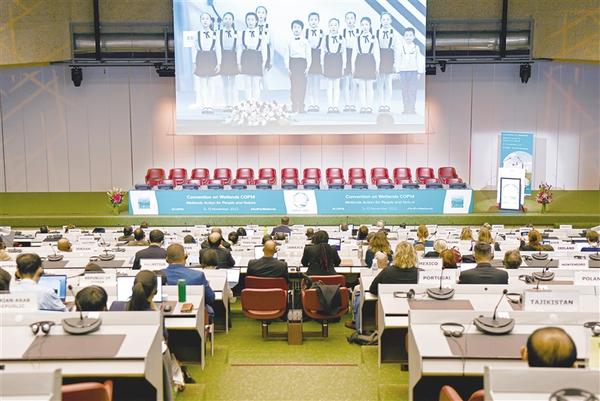11月5日,在瑞士日内瓦国际会议中心,《湿地公约》第十四届缔约方大会与会代表观看中国武汉会场的开幕式。《湿地公约》第十四届缔约方大会11月5日至13日在中国湖北武汉和瑞士日内瓦同步举行,主题为“珍爱湿地,人与自然和谐共生”。新华社记者 连漪 摄