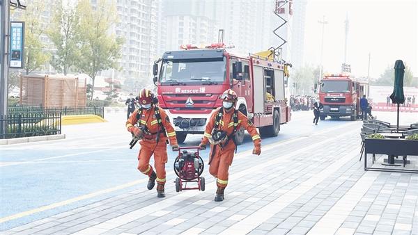 活动现场,开发区消防救援大队组织了灭火应急演练,充分展示了消防救援力量,有效检验了火灾急救处置以及协同作战能力。