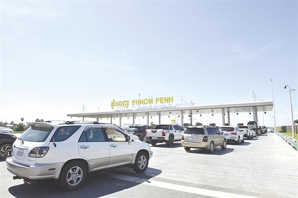 11月7日,车辆在柬埔寨首都金边的金港高速公路入口处排队。