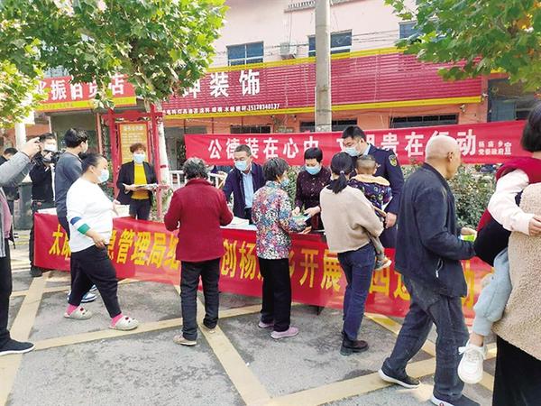 11月1日,太康县应急管理局党委书记、局长冯素梅带队走进杨庙乡开展结对帮扶志愿服务活动,助推乡村精神文明建设。图为该局工作人员向过往群众发放宣传页。 记者 王凯 通讯员 王锦想 摄