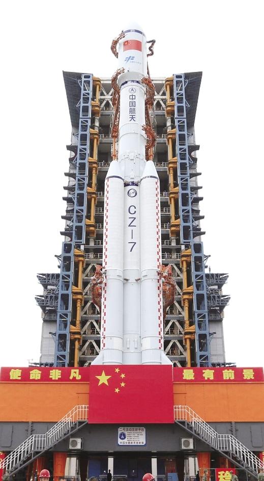 11月9日,天舟五号货运飞船与长征七号遥六运载火箭组合体转运至发射塔架。