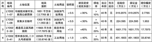 七、挂牌时间及网址 挂牌报价时间:LY2021-07地块,2022年12月5日9时至2022年12月14日15时;LY2021-08地块,2022年12月5日9时至2022年12月14日15时10分;LY2022-30地块,2022年12月5日9时~2022年12月14日15时20分;LY2022-41地块,2022年12月5日9时~2022年12月14日15时30分;挂牌网址:鹿邑县公共资源交易平台(http://www.lyggzyjy.org.cn/)。