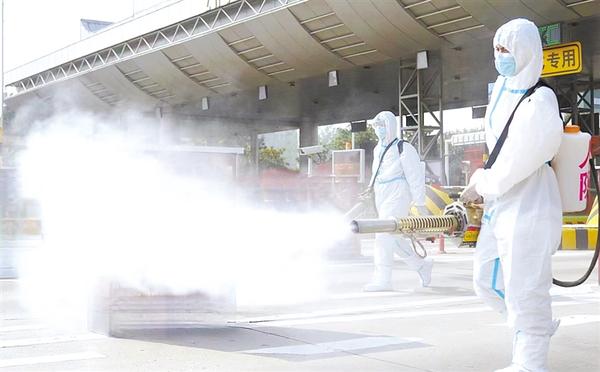 为把好疫情输入关口,严格落实人物环境同防,保护人民群众身体健康,我市加大对各高速路口的消杀力度,进一步筑牢疫情防控防线。图为昨日商水县红十字会义务消杀志愿者在宁洛高速出入口开展防疫消杀工作。记者 付永奇 摄