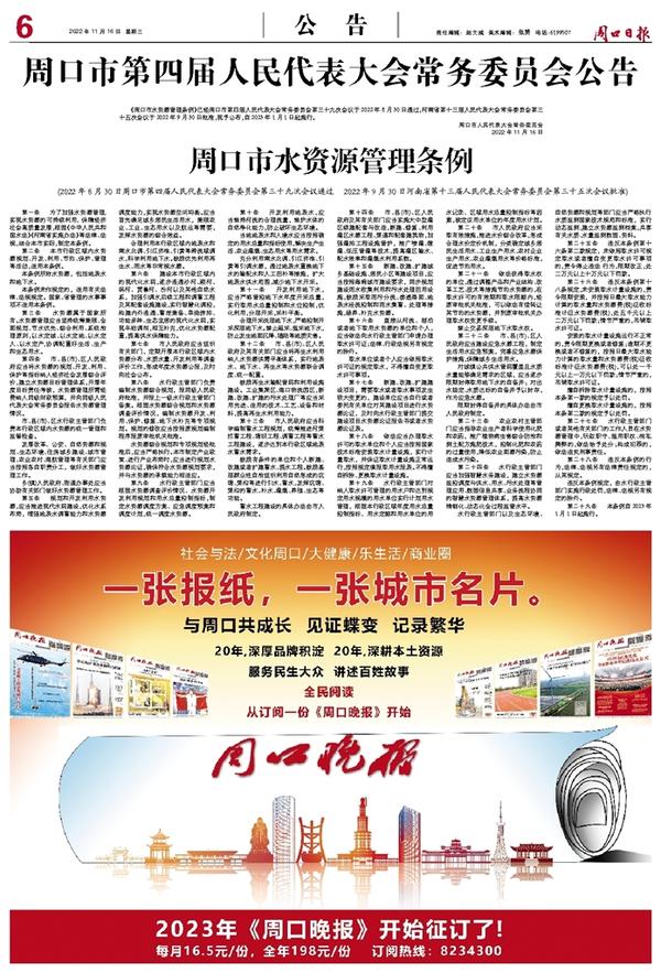 《周口市水资源管理条例》已经周口市第四届人民代表大会常务委员会第三十九次会议于2022年8月30日通过,河南省第十三届人民代表大会常务委员会第三十五次会议于2022年9月30日批准,现予公布,自2023年1月1日起施行。