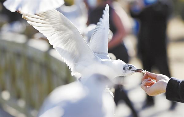 这是水系环绕的宁夏银川市花博园和在宁夏银川市海宝公园被游客喂食的红嘴鸥(右上图)。