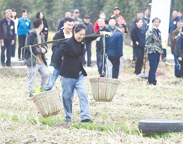 11月15日,参赛村民参加“扁担挑粮”趣味比赛。当日,浙江省杭州市余杭区瓶窑镇13个村的近200位“劳动能手”齐聚瓶窑镇西安寺村,参加农民丰收趣味运动会。近年来,杭州市余杭区瓶窑镇围绕农业主导产业和优势特色产业,打造全域农文旅融合的大格局,更好地带动村集体增收、百姓致富。新华社发