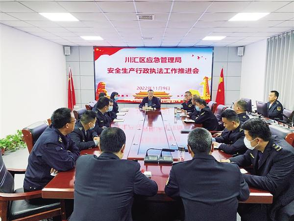 本报讯 (记者 王凯 文/图) 为扎实推进安全生产行政执法工作,11月9日,川汇区应急管理局召开安全生产行政执法工作推进会。会议由区应急管理局党委书记、局长穆磊主持,班子成员、执法队员参会(如图)。