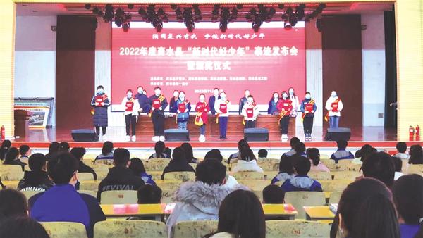 商水县文明办、县教体局、团县委、县妇联等单位日前联合举办2022年“新时代好少年”事迹发布会暨颁奖仪式。据悉,此次评选活动授予10名学生“新时代好少年”荣誉称号、8名学生“新时代好少年”提名称号。图为颁奖现场。记者 马治卫 通讯员 彭明伟 摄