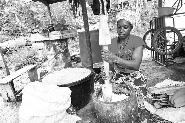 11月16日,在喀麦隆南部大区曼贡市一村庄,一名女子捣烂木薯根。