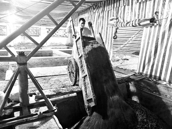 11月30日,淮阳区刘振屯镇的紫荆花酒业公司车间内,工人忙着将糖化后的高粱、稻谷等原料窖藏。据了解,20多年来,该企业始终坚持以优质高粱为原料,用传统工艺酿制酒品,得广大客户的认可。记者 侯俊豫 摄