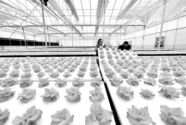 11月29日,宣恩县椒园镇锣圈岩村的农民在温控大棚里检查水培蔬菜的生长情况。