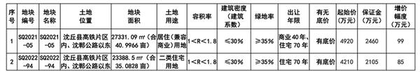 五、拍卖时间及网址 拍卖报价时间:SQ2021-05号地块:2022年12月23日10时,SQ2022-94号地块:2022年12月23日10时10分。拍卖网址:周口公共资源交易系统(网址:http://jyzx.zhoukou.gov.cn)。