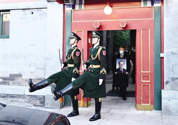 灵车缓缓驶出中南海,在中南海工作的干部职工纷纷来到道路两旁,胸佩白花、神情凝重,为江泽民同志送别。