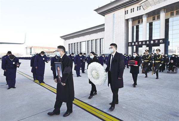灵车缓缓驶入西郊机场。松柏静立,远山静默。空军官兵列队脱帽,目送载护江泽民同志骨灰的专机起飞。专机盘旋着,在首都北京上空缓缓绕飞一周,告别这一江泽民同志为党和国家事业倾尽心血的地方。
