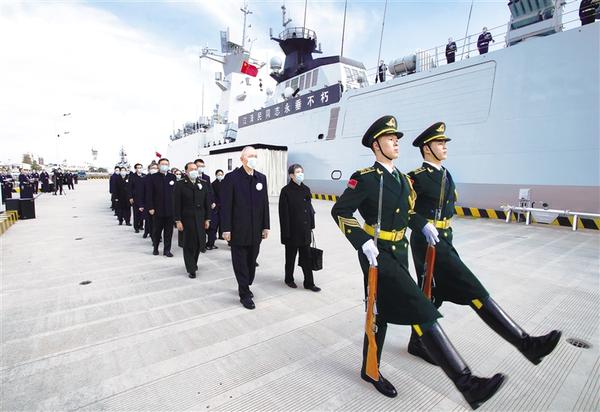 中国人民解放军海军扬州舰伏波静卧,舰上官兵分区列队、肃立舷边。扬州是江泽民同志的故乡。今天,这艘以扬州命名的军舰,以最高礼仪送别这位为党和人民建立了不朽功勋的卓越领导人。江泽民同志的亲属捧护着骨灰登上扬州舰。海军笛吹响,仪仗队持枪肃立,行注目礼。当扬州舰起航时,军港内所有舰船汽笛长鸣,响彻云霄。
