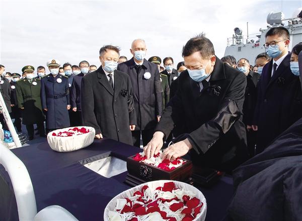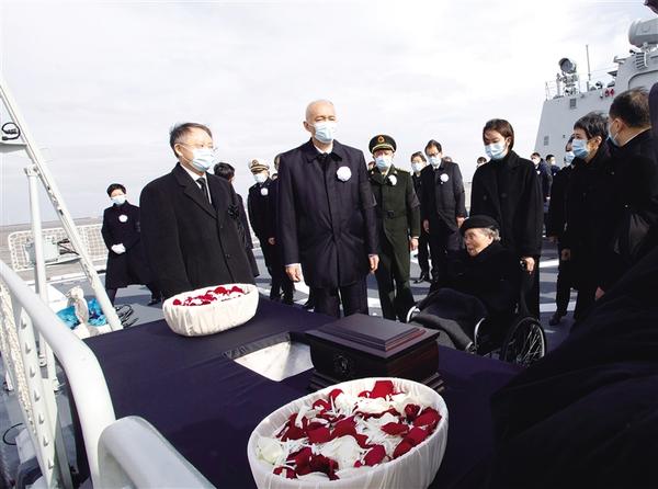 中午12时35分,扬州舰抵达长江入海口水域。在军舰甲板上,送别的人们,肃立默哀。水天肃穆,波翻浪涌。蔡奇和江泽民同志的夫人王冶坪等亲属,眼含热泪,强忍悲痛,将江泽民同志的骨灰和缤纷的花瓣一起缓缓撒向无垠的江海。