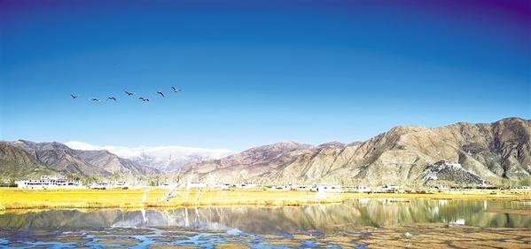 成群的候鸟飞过唐嘎湿地(12月10日摄,手机照片)。 唐嘎乡位于拉萨市达孜区东北部,这里每年冬季都会迎来黑颈鹤、斑头雁、赤麻鸭等候鸟。这些珍稀鸟类时而在空中盘旋,时而栖息在水边,营造出一幅生机盎然的冬季画卷。 新华社记者 沈虹冰 摄