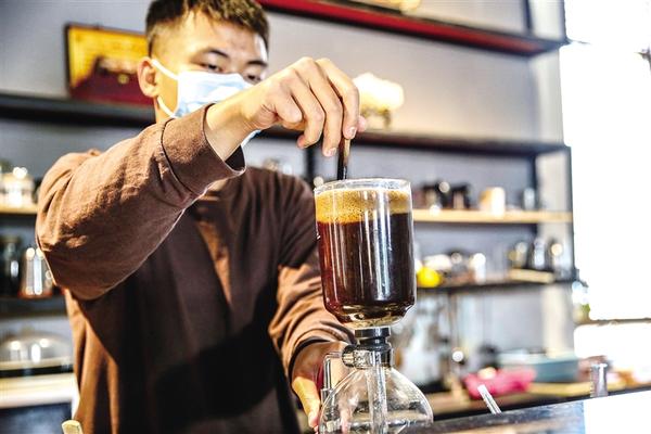 12月10日,在位于海南澄迈的才存咖啡馆,返乡大学生、咖啡师徐取凡在煮咖啡。