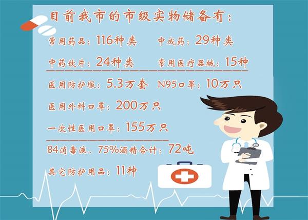 据介绍,目前我市的市级实物储备有:常用药品116种类,中成药29种类,中药饮片24种类,常用医疗器械15种,医用外科口罩200万只,一次性医用口罩155万只,N95口罩10万只,医用防护服5.3万套,84消毒液、75%酒精合计72吨,其它防护用品11种。
