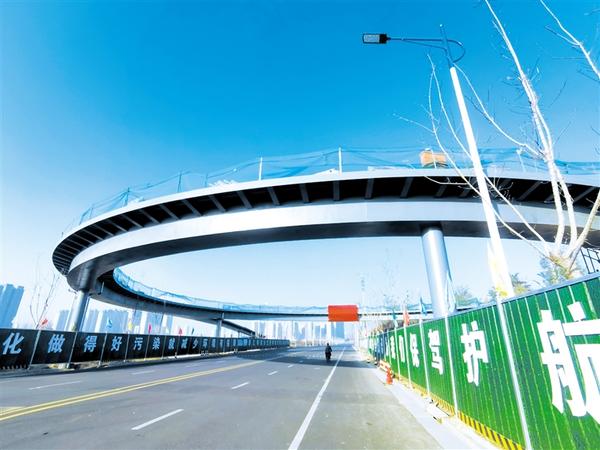 滨河南路人行天桥项目负责人刘新新说:“跨滨河路人行天桥钢箱梁主体已完成,目前正在进行装饰装修工作,计划今年年底达到向市民开放的条件。”
