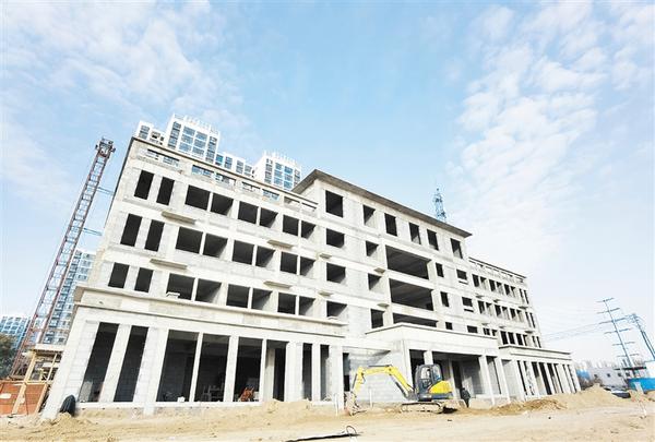 近日,记者从开发区获悉,集行政服务、文化体育、移风易俗广场、新型商业等功能于一体的太昊路办事处许寨社区综合服务中心项目即将完工。图为蓝天白云下的太昊路办事处许寨社区综合服务中心项目。 记者 王晨 摄